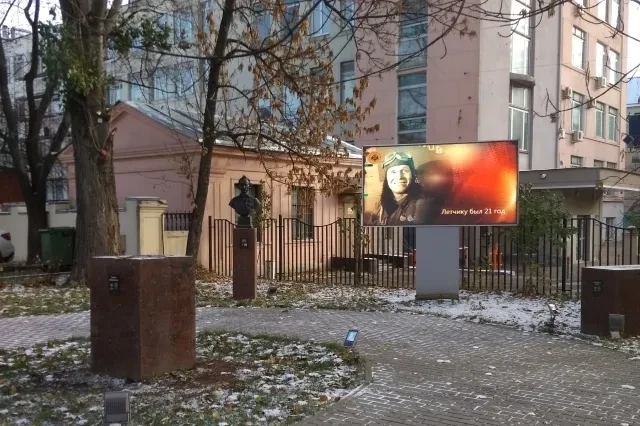 Уже после того, как Военно-историческое общество троекратно открестилась от какого бы то ни было отношения к Скверу полководцев, хмурые рабочие сняли и увезли куда-то бюсты героев Двенадцатого года и врыли столб с огромной плазменной панелью, на которой (под логотипом РВИО) в режиме нон-стоп транслируют календарь знаменательных дат и видеосюжеты о летчиках-героях. Собственно, ничего плохого в этом я не вижу хотя можно бы и попридираться — почему о летчиках? Почему — только о летчиках?