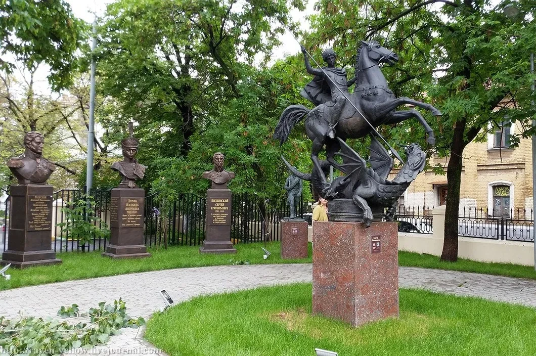 Вообще-то он маленький и уютный, и всем бы хорош, но по периметру скверик напротив бывшего офиса РВИО (а теперь офиса дирекции Росконцерта) уставлен крупноформатными бронзовыми бюстами, как следовало понимать, полководцев. Перечислю: