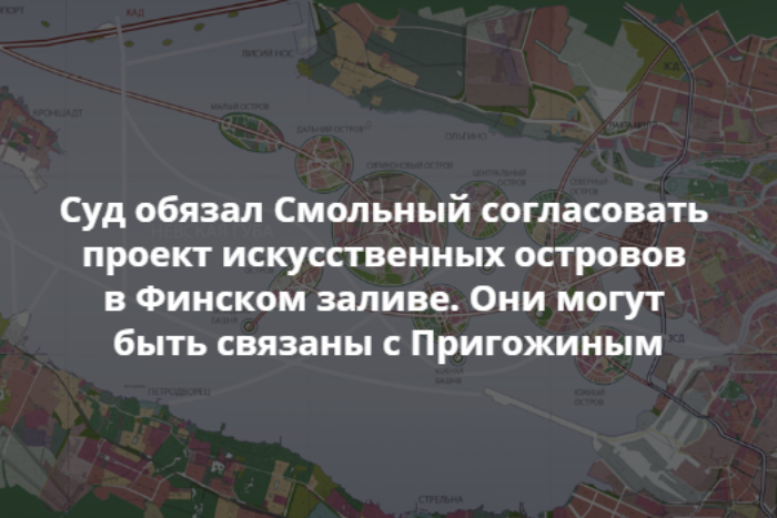 Арбитражный суд удовлетворил иск компании «Зингер девелопмент» и признал незаконным отказ Смольного согласовать проект компании об искусственных островах в Финском заливе. Проект может быть связан с бизнесменом Евгением Пригожиным. Об этом пишет «Фонтанка» со ссылкой на комитет имущественных отношений.