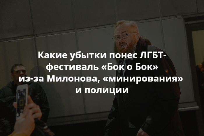 Депутат Госдумы Виталий Милонов 24 октября сорвал открытие ЛГБТ-кинофестиваля «Бок о Бок». После этого с фестивалем отказалась сотрудничать одна из площадок, а другую во время показов эвакуировали из-за звонка о минировании. Организаторы говорят, что после проверки полиция предложила им отменить фестиваль.