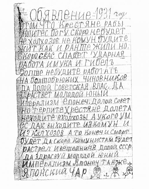 «О том, что крестьяне рабы. Молитесь богу, скоро не будет ни колхозов ни коммун. Будите жить как и раньше жили, но скоро с вас спадет ударная работа и мука и гибель. Больше не будите работать на большобрюхих чиновников. Долой Советская власть, да здравствует молодой юный империализм епонеч. Долой совет. Но терпите хрестяне до лета, не ходите в колхозы, а у кого ум есть дак выходите из коммун и из колхозов, а то конец и смерть будет. Да скоро коммунистам будет расстрел и вешельнича. Долой СССР, да здравствует молодой юный империализм».