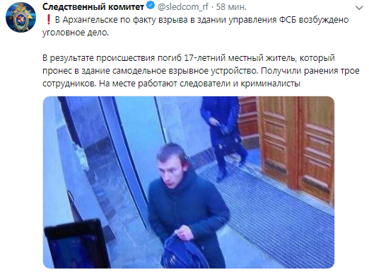 В Национальном антитеррористическом комитете РФ сообщили, что мужчина, который погиб в результате взрыва в здании УФСБ по Архангельской области, сам принес бомбу: «По предварительной информации лицо, вошедшее в здание, достало из сумки неустановленный предмет, который спустя некоторое время взорвался у него в руках, в результате чего он получил ранения, несовместимые с жизнью. При этом ранение разной степени тяжести получили также три сотрудника управления ФСБ».