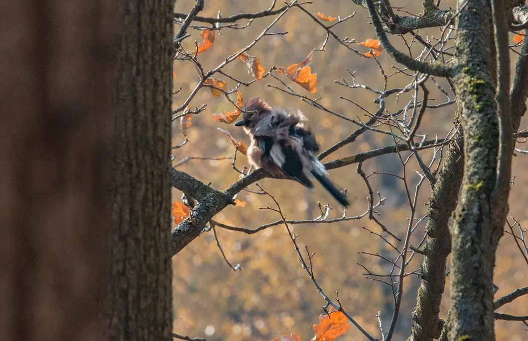 А потом я засекла сойку. Вернее, просто что-то большое и пухлое, а вот Михаилу даже в бинокль смотреть не пришлось. Описал всю, как на фото.