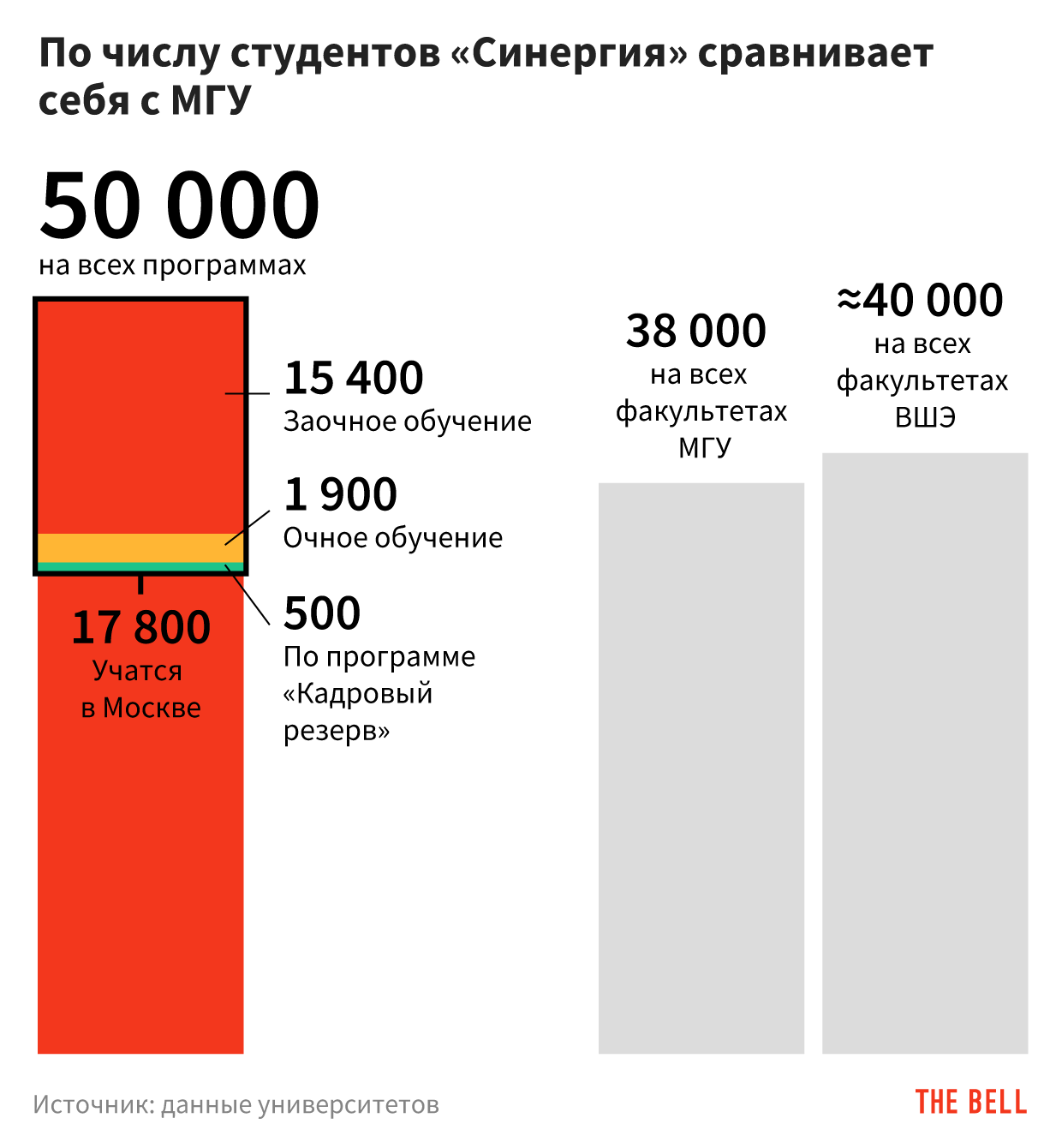 «Кадровый резерв» — машина по набору новых студентов. В том числе благодаря ей «Синергия» за несколько лет стала крупнейшим по числу учащихся частным вузом в России. Сама «Синергия» по этому показателю уже сравнивает себя с МГУ.