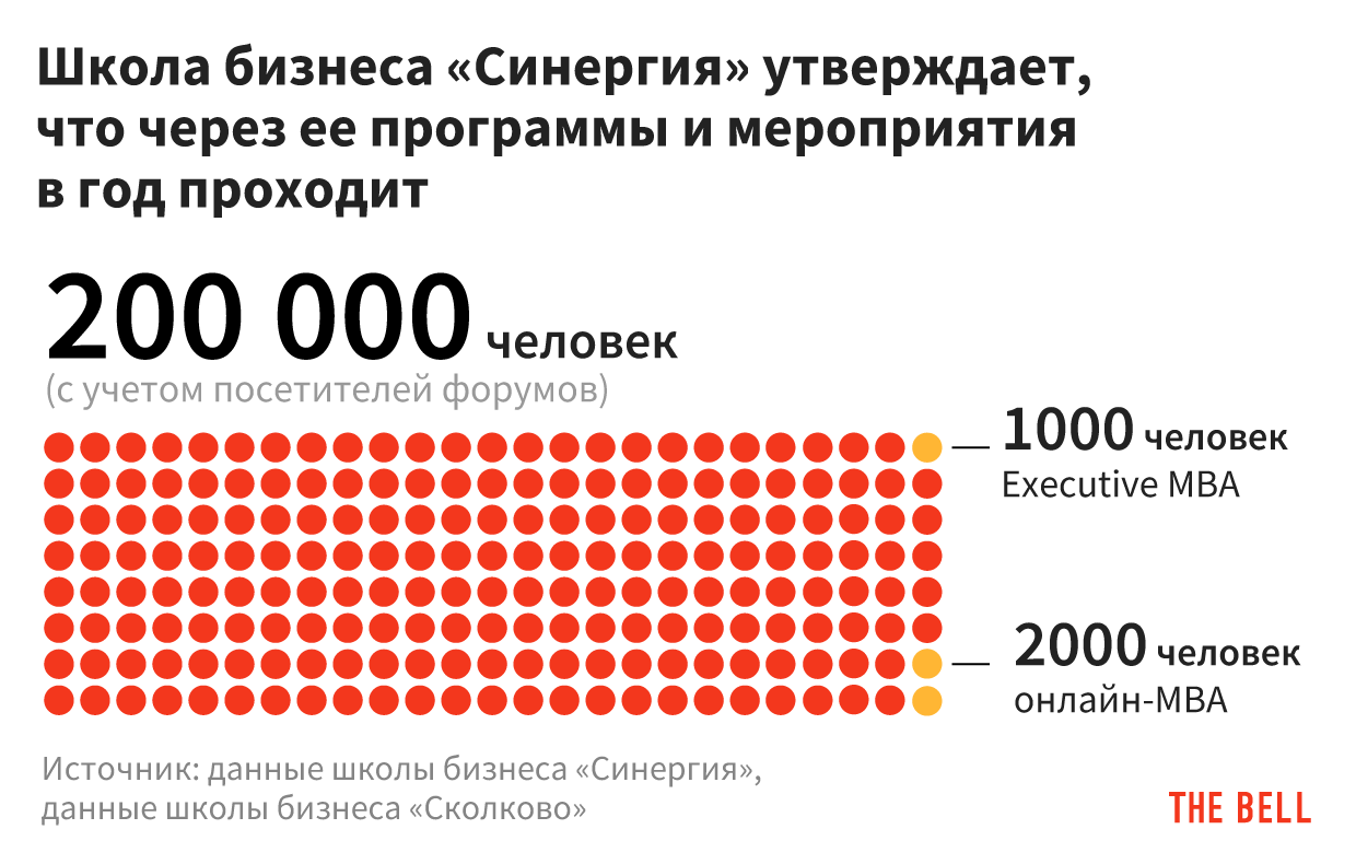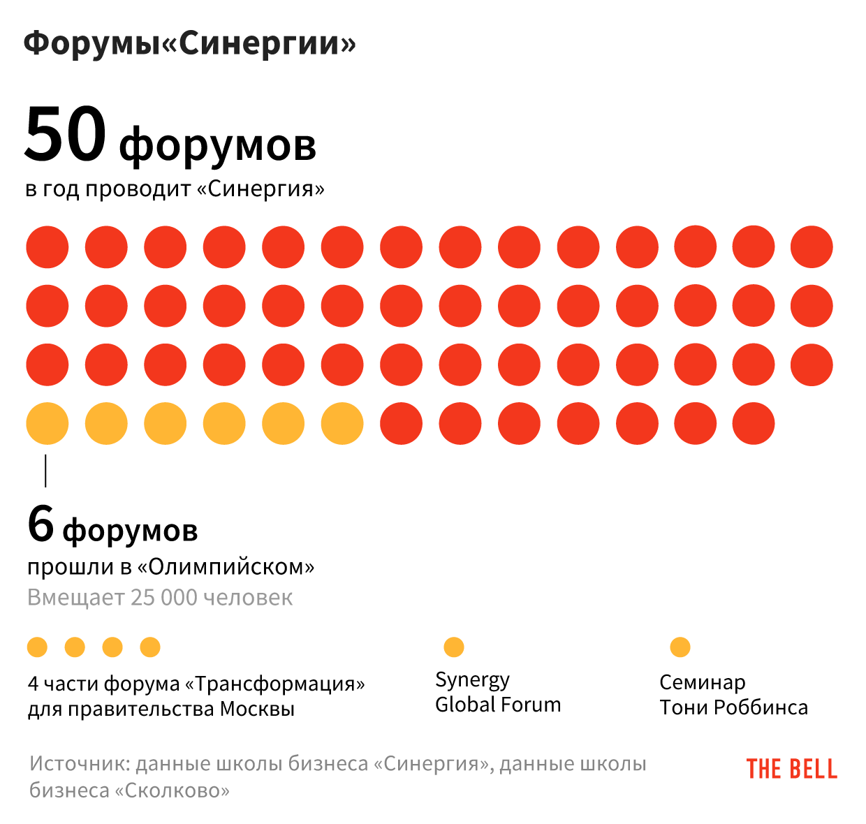 В «Олимпийском» «Синергия» собирает по 25 тысяч человек, билеты на ее форумы стоят от 15 до 500 тысяч рублей. Но не на каждом из них компании удается заработать, признает Аветов (точные цифры о своих мероприятиях группа не раскрывает). Форумы для «Синергии» — дорогая, но эффективная реклама для одноименного конвейера в сфере образования.