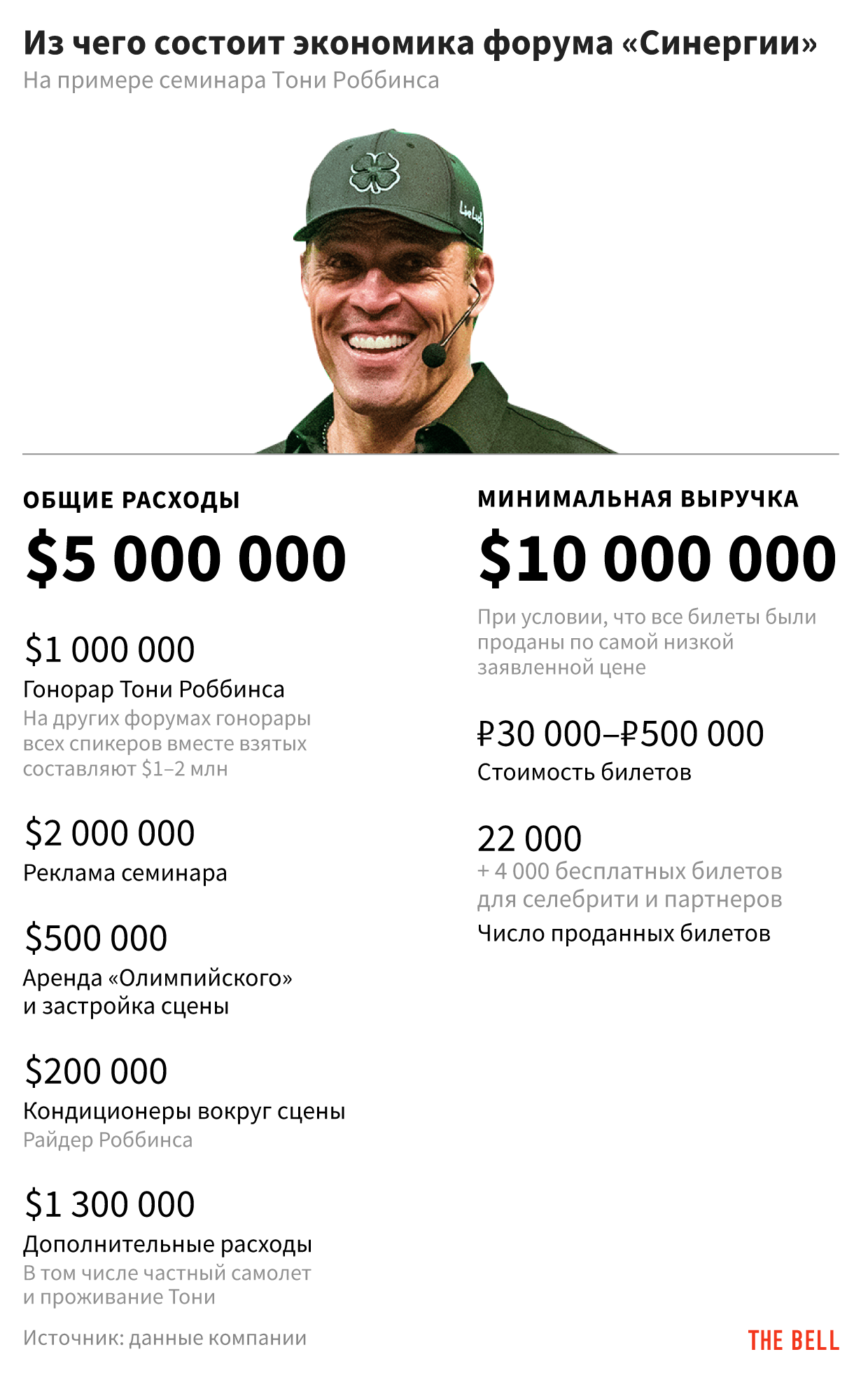 Сколько компания потеряла на этом форуме, руководители «Синергии» не раскрывают. Но признают, что им не удалось продать все билеты по заявленной цене — от $2 тысяч до $10 тысяч. К концу продаж цены пришлось снижать — вплоть до $100, а за неделю до мероприятия их даже раздавали бесплатно в университетах, библиотеках и кофейнях, рассказал The Bell собеседник из команды организаторов. Лобов в ответ демонстрирует на своем смартфоне проморолик с полным залом. Главная проблема, по его словам, была геополитической. В разгар визовой войны с США многие сотрудники «Синергии» не смогли выехать на место: вместо команды из 200 человек вся организация легла на 20 человек. Запланированный на апрель этого года и не раз переносившийся Synergy Inspiration Day в Нью-Йорке с участием мотиваторов Ника Вуйчича и Леса Брауна пока так и не состоялся.