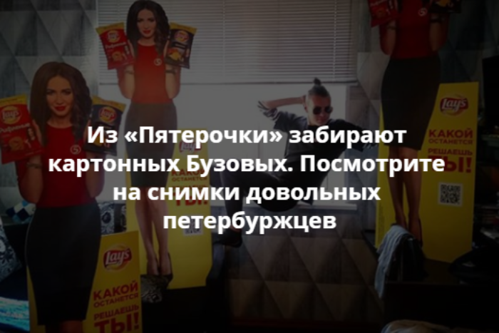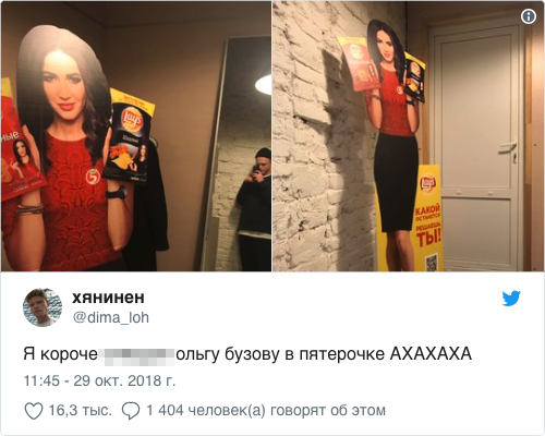 В конце октября петербуржец c ником dima_loh украл из «Пятерочки» картонную фигуру Ольги Бузовой. Его примеру последовали еще несколько людей. А потом сеть супермаркетов объявила, что стенд с певицей можно забирать, — и некоторые так и сделали.