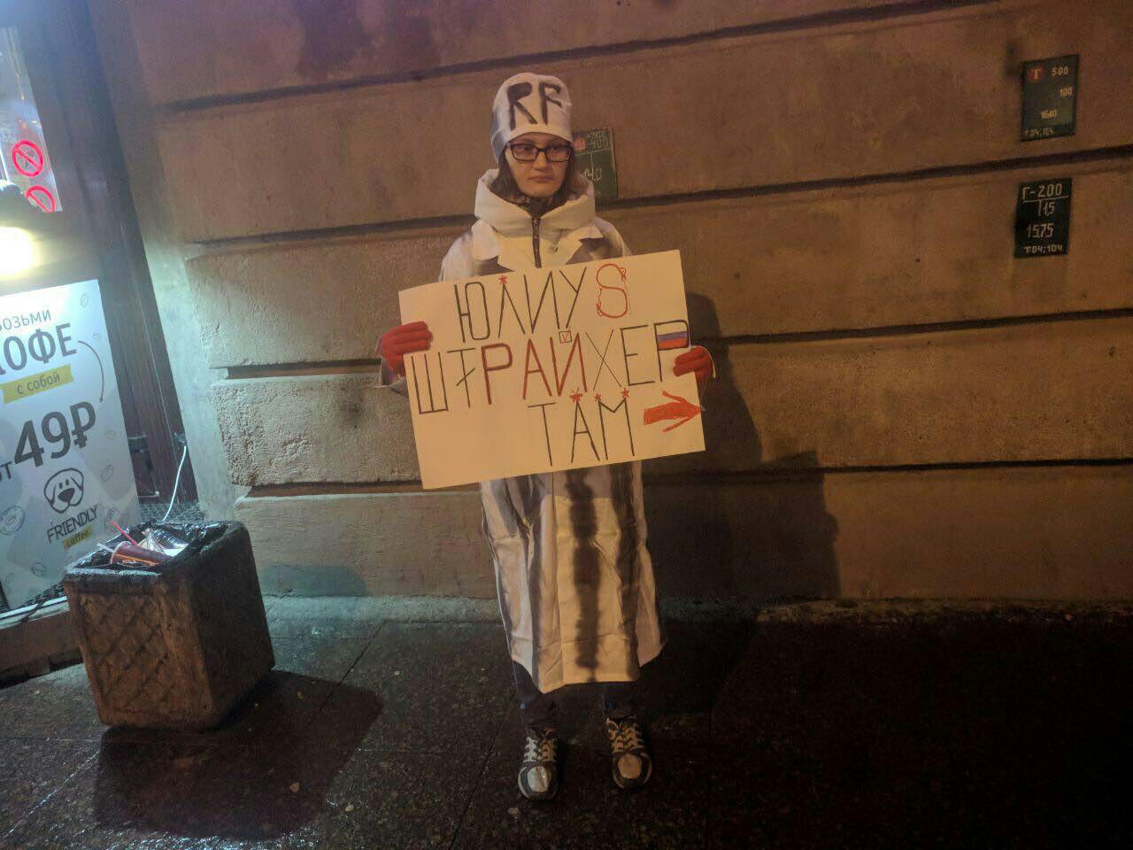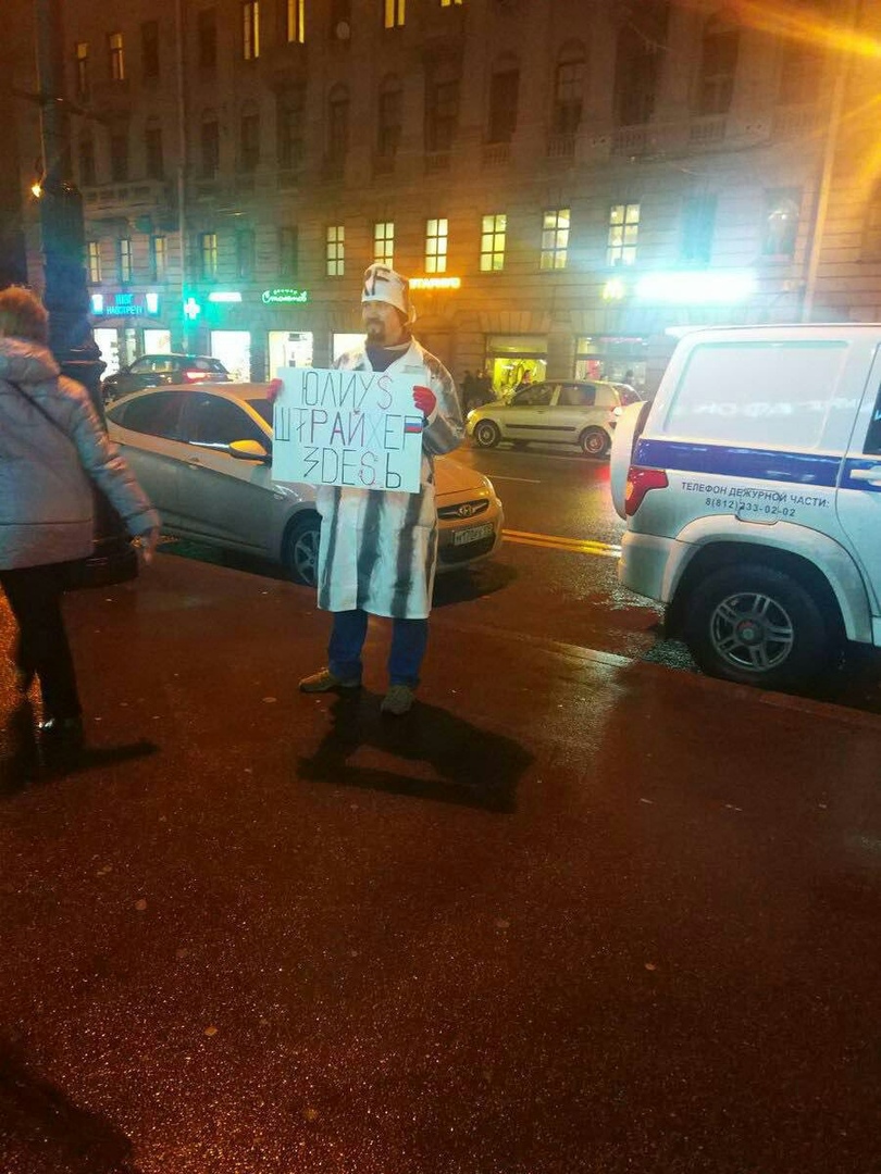 «Я по дивным песням соловьев нахожу», — написано на одном плакате. «Юлиус Штрайхер (главный редактор антисемитской газеты Германии и идеолог расизма — прим. „Бумаги“)», — написано на другом.