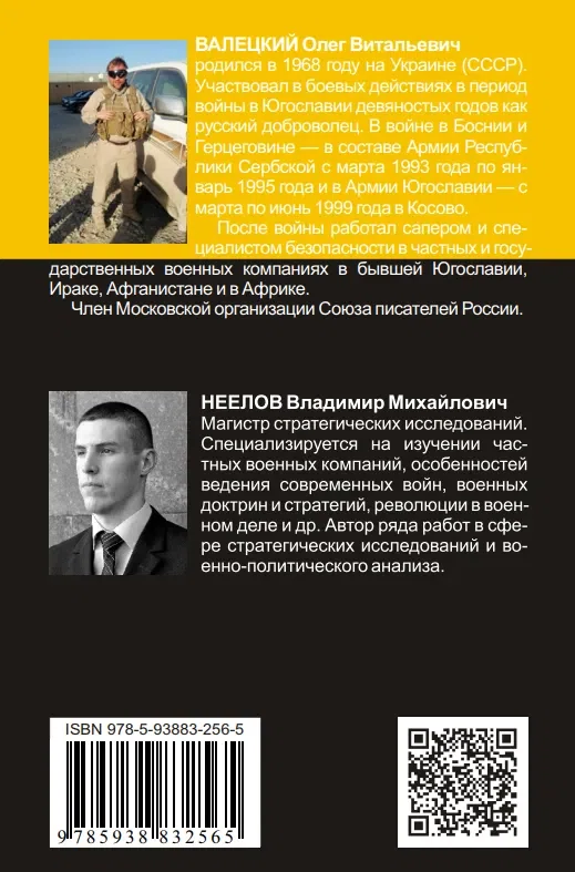 Так, мы нашли научные работы Владимира Неелова в соавторстве с Олегом Валецким. Например, одна из них — «Особенности партизанских и противопартизанских действий (2003–2011) в ходе Иракской войны 2003-2011» — выложена в сети с обложкой, где есть представление авторов. Неелов там указан как «магистр стратегических исследований», специализирующийся на теме ЧВК. Валецкий Олег Витальевич — член Московской организации Союза писателей, работал сапером и экспертом по безопасности в ЧВК, а ранее имел многолетний военный опыт в Афганистане и на Балканах.