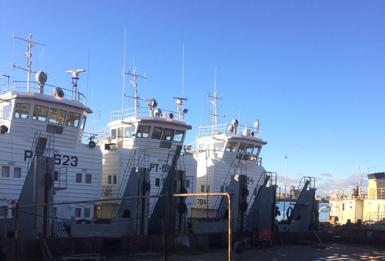 После рейсов с грузами на северные месторождения теплоходы пришли домой. На каждом из них команда 6–7 человек.
