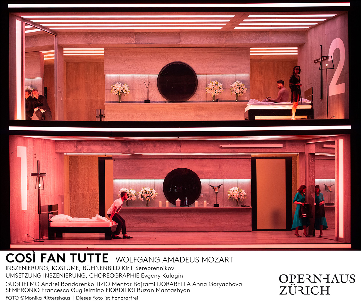 — В решении суда сказано, что Кирилл может делать: гулять два часа, также судья может разрешить звонок близкому. По телефону он может общаться только с адвокатами и отцом. На интернет у Кирилла тоже наложен запрет. Вся коммуникация проходит только через его адвоката: мы записываем видео с репетициями, которые я делаю, и тот передает их Кириллу, который присылает нам ремарки. Ему разрешено пользоваться компьютером. К счастью, в XXI веке это возможно сделать быстро.Перемещение Кирилла отслеживается: он носит специальный браслет на ноге, я не знаю, прослушивают его или нет. Просто Кирилл соблюдает режим — и все. Сами знаете, что за нарушение ничего хорошего не будет. Я ничего не боюсь. Страх съедает душу — вот и все, что я могу на это сказать.Афиша оперы Cosi fan tutte. Фото: Открытый мир