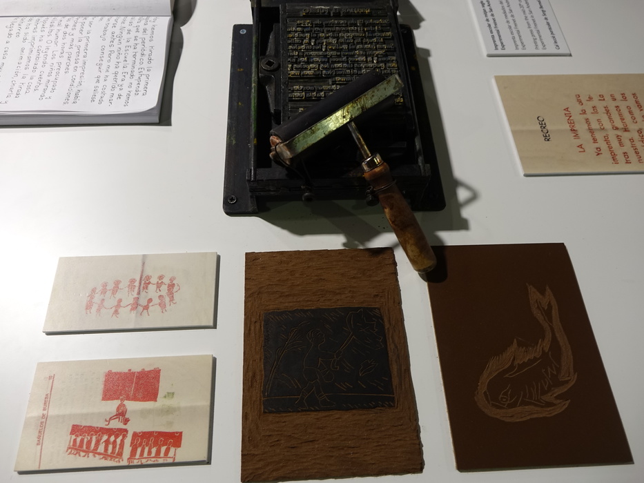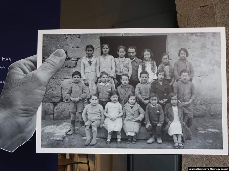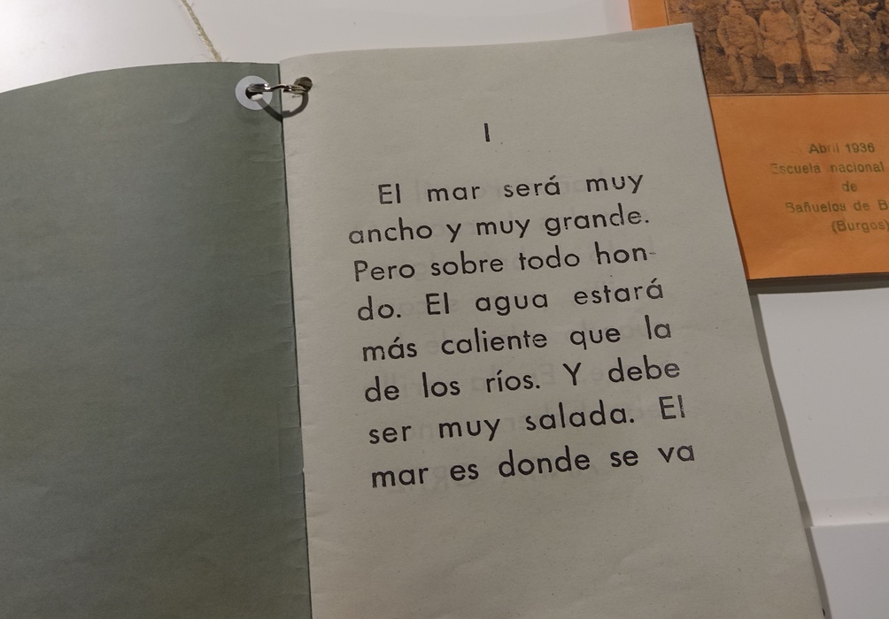 Вход на выставку – фотография дверей школы, тот же самый ракурс, что и на обложке книги "Фотограф". Герои фотографии словно забежали внутрь здания – ряд деревянных туфель располагается вдоль стены. Фотограф тоже в школе, он оставил свою камеру без присмотра. Пройдя через дверь, попадаем в класс. Школьная доска, парты, карта мира, экраны, на которых идут фильмы о гражданской войне и о деревенской жизни Испании. А рядом – столы, на которых стоит типографская касса, разложены школьные издания, тетрадки, статьи, коллекция ракушек и природных материалов, сброшенная змеиная кожа, гербарий, термометр, граммофон, небольшая библиотека. Здесь "Платеро и я", "Питер Пен и Венди", "Дон Кихот". Дальше – зал с фотографиями общей могилы и зал с бесконечно отражающейся в зеркалах панорамой морского берега. Здесь – большие ракушки, которые можно приложить к уху и услышать детские голоса.