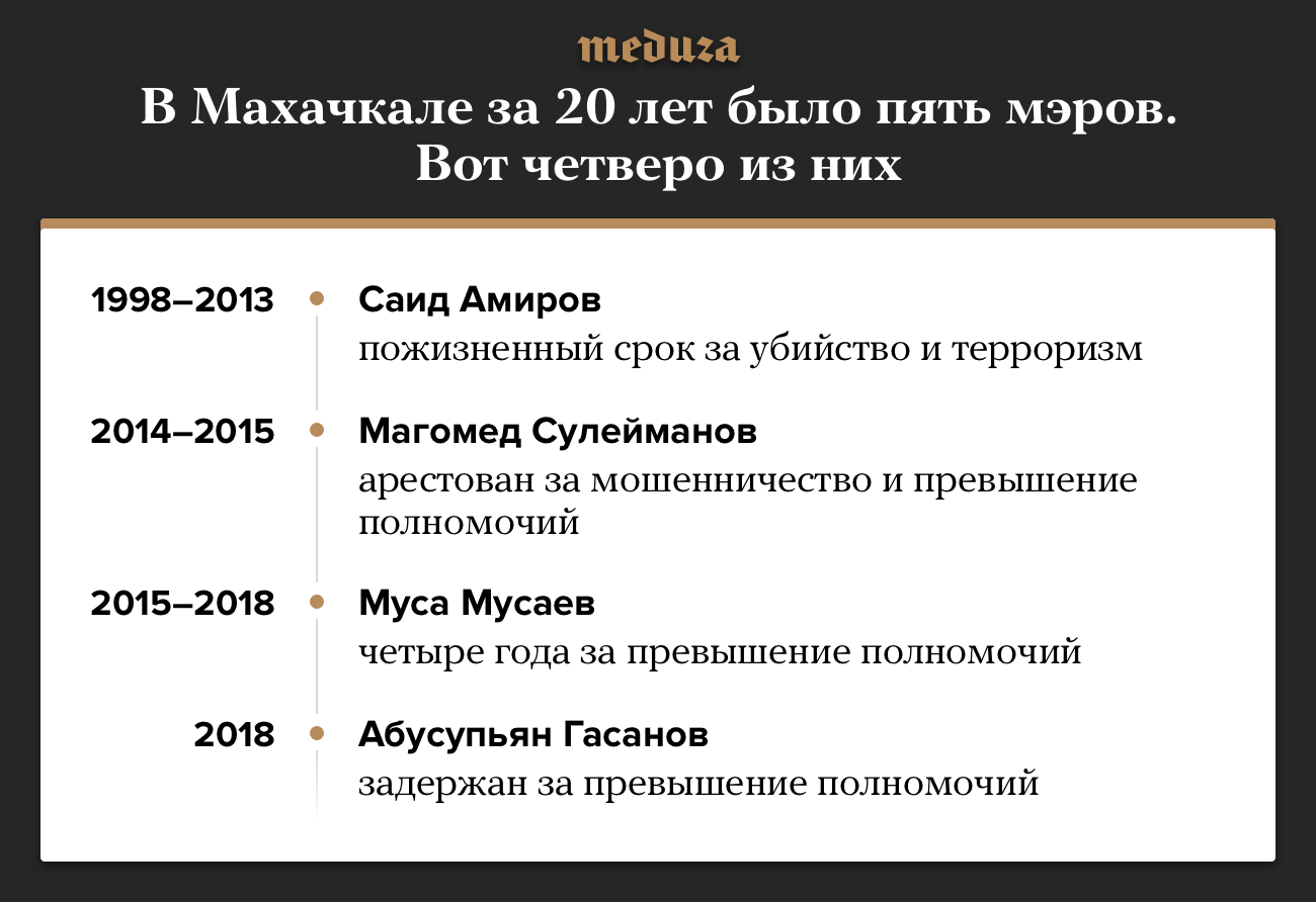 7 ноября стало известно о задержании исполняющего обязанности мэра Махачкалы Абусупьяна Гасанова по делу о превышении должностных полномочий. Несколько недель назад его предшественник на этом посту Муса Мусаев был осужден на четыре года по той же статье.