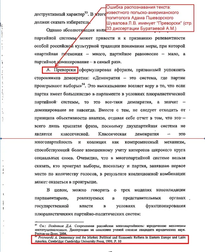 Диссертация этой ученицы проф. Шутова содержит 90 страниц, очень похожих на заимствования, причем очень смешные. Так, 22 страницы диссертации Людмилы Шуваловой выглядят как абсолютная копия 22 страниц диссертации Александры Буратаевой, включая цитату из политолога Адама Пшеворски. Только у Шуваловой, вероятно из-за допущенной технической ошибки, знаменитый ученый стал «Преворским». Вероятно, сама Шувалова книжку Пшеворского в руках не держала, и, судя по всему, ограничилась обзором, который сделала Буратаева, — в ее, кстати, переводе и с ее комментариями.