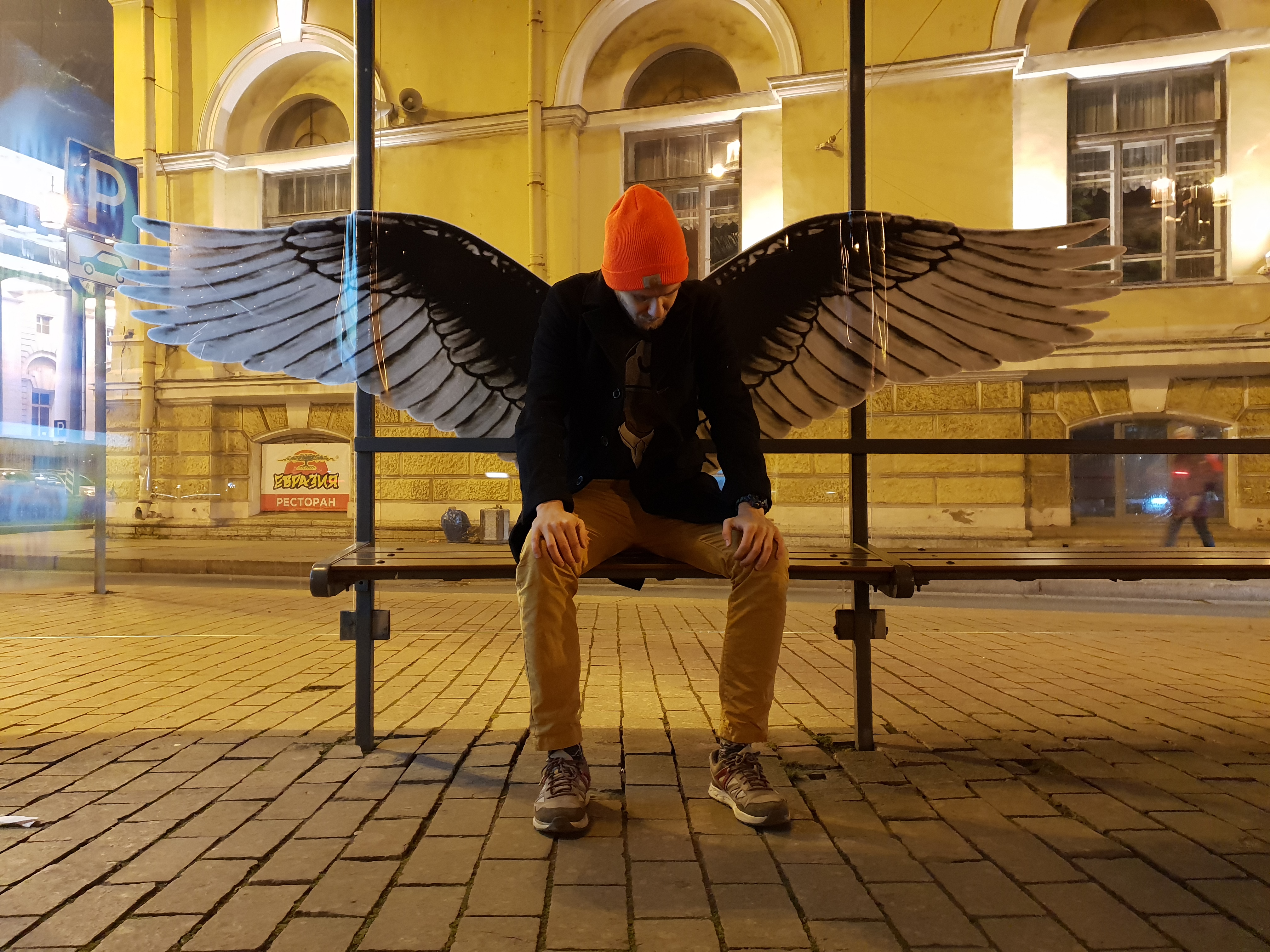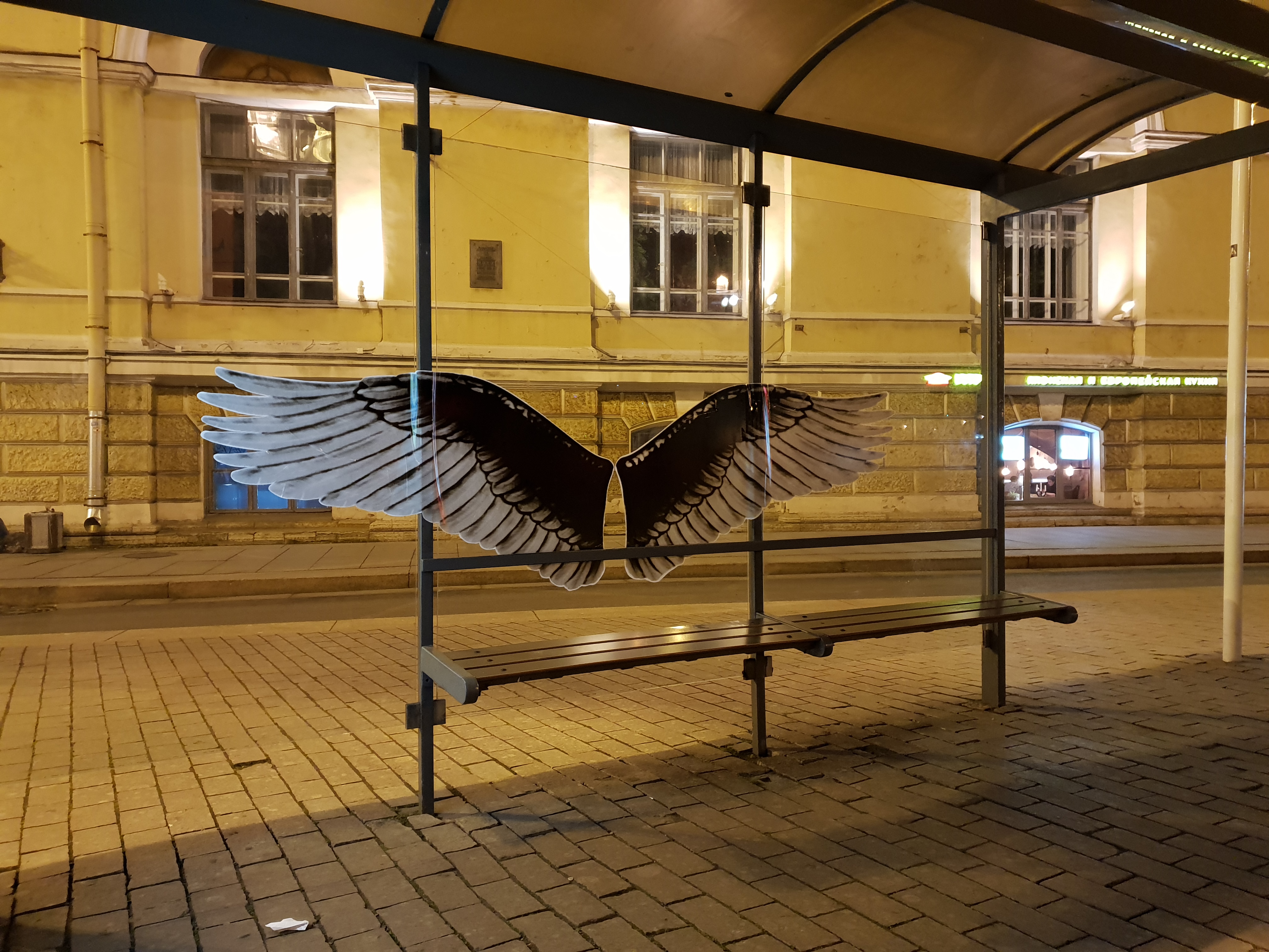 В ночь на 7 ноября на стекле остановки «Биржевая площадь» на Васильевском острове нарисовали массивные крылья. Это воспроизведение проекта уличного художника Паши 183 «Питер — город ангелов».