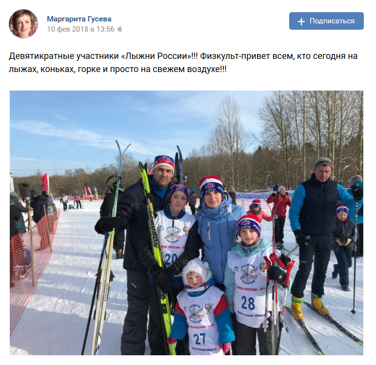 "Девятикратные участники Лыжни России!!! Физкульт-привет всем, кто сегодня на лыжах, коньках, горке и просто на свежем воздухе!!!", – написала потом глава города у себя на странице во "ВКонтакте".