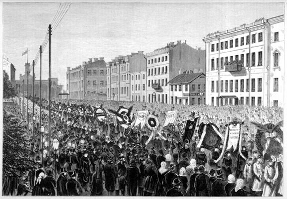 Корреспондент лондонской газеты «Таймс» написал о петербургском прощании с Тургеневым: «Гроб, ещё в пути засыпанный цветами, в половине одиннадцатого утра прибыл на Варшавский вокзал, где был встречен с такими почестями, какие ещё никогда не воздавались ни одному неофициальному лицу в России. В громадной толпе, собравшейся у вокзала, были представлены, в сущности, все уголки огромной империи… Там были депутаты с Кавказа, из Сибири, Финляндии и даже Средней Азии. Сто семьдесят шесть депутаций, каждая со своим венком… потянулись от вокзала по забитым народом улицам».