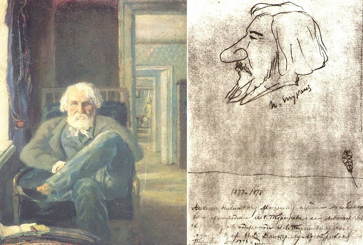 Портрет Тургенева работы Якова Полонского (слева) и автошарж 1877-1878 годов (справа).