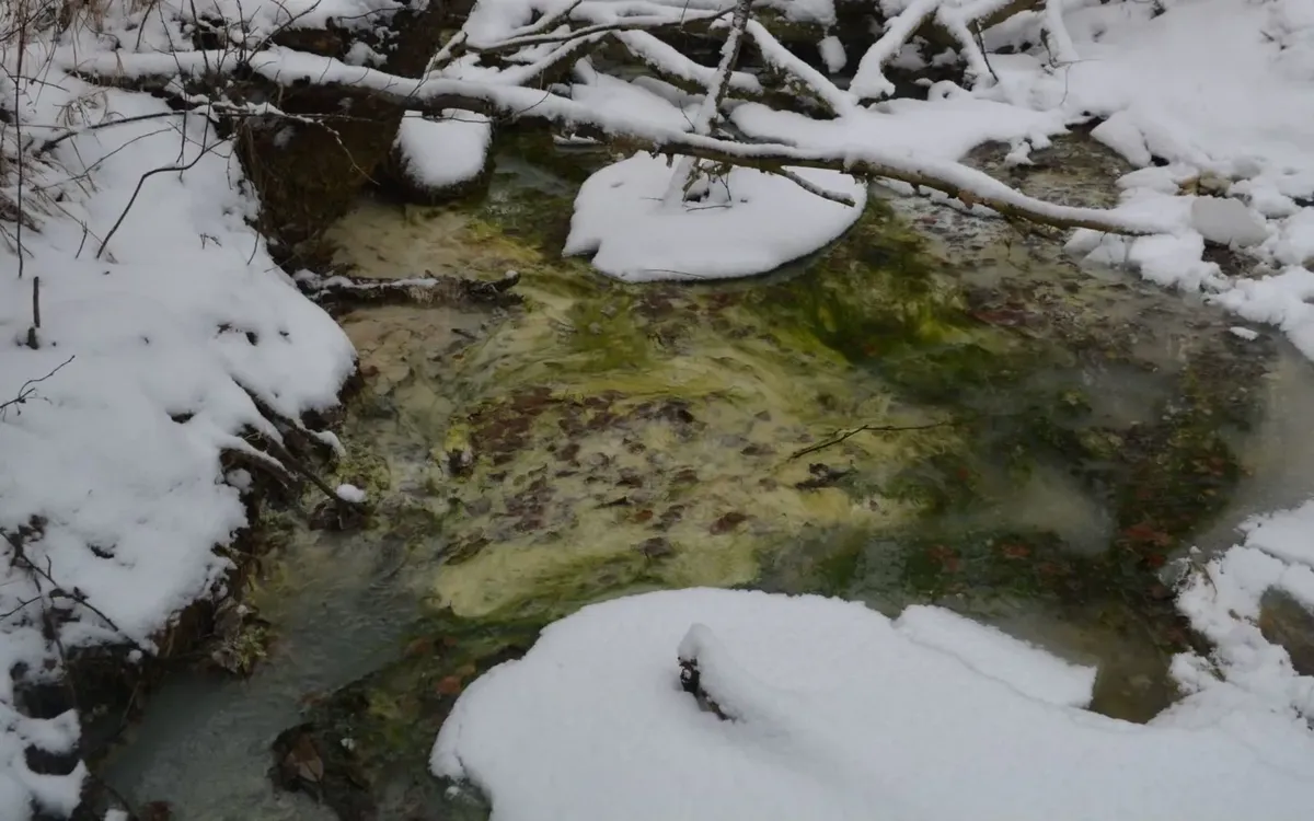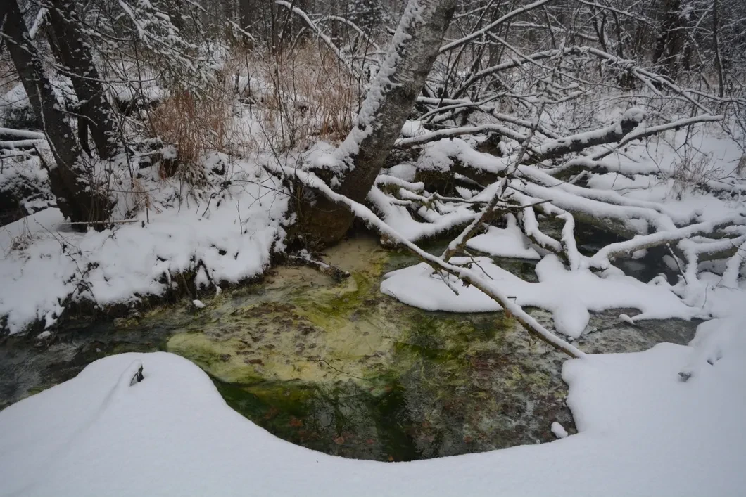 Идем вдоль Ольховки в сторону Ново-Шемурского месторождения. Дойти до него по реке не получится — холодно и далеко. Но чем ближе к нему, тем страшнее. По реке плывет зеленая пена. В застойных участках она скапливается и замерзает в зеленый лед.