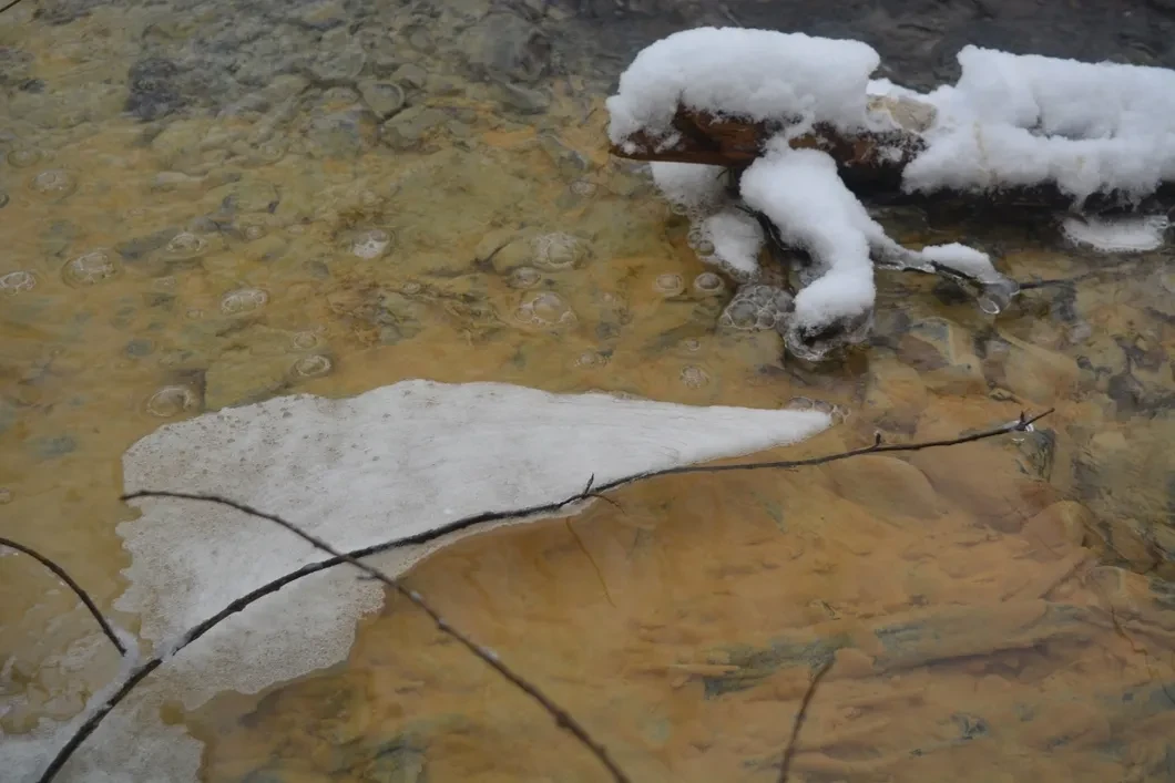 Вода действительно прозрачная и вкусная. Однако уже через несколько метров картина меняется. Появляется бледно-желтый лед, а устье Ольховки — не замерзшее и полностью желтое. Цвет ему придает густой осадок на дне.