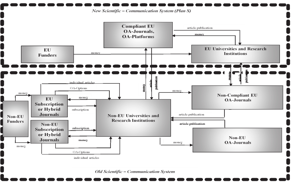 Следует ожидать, что неевропейские университеты и исследовательские организации, заинтересованные в интеграции в рамках Плана S, будут вносить деньги в релевантные EU-Journals&Platform, как показано на схеме. При договоренности между ЕС и заинтересованными странами, не входящими в него, возможен вариант внесения средств в европейские фонды, минуя институциональный уровень взаимодействия, показанный на схеме.
