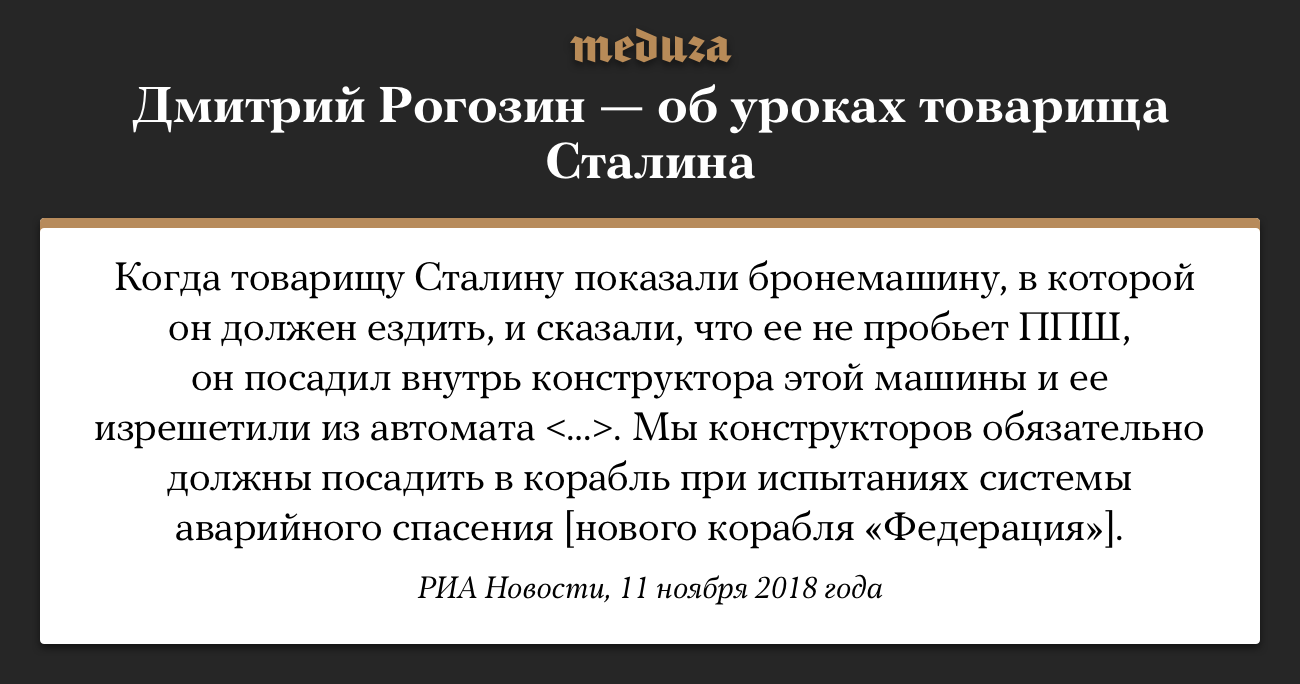 Дата11.11.2018АвторСкрытИсточникМедузаСохранённая копияInternet ArchiveOriginal MaterialShow translationДмитрий Рогозин решил осваивать космос с учетом опыта «товарища Сталина». Цитата Фото в анонсе: Сергей Бобылев / ТАСС / Scanpix / LETA
