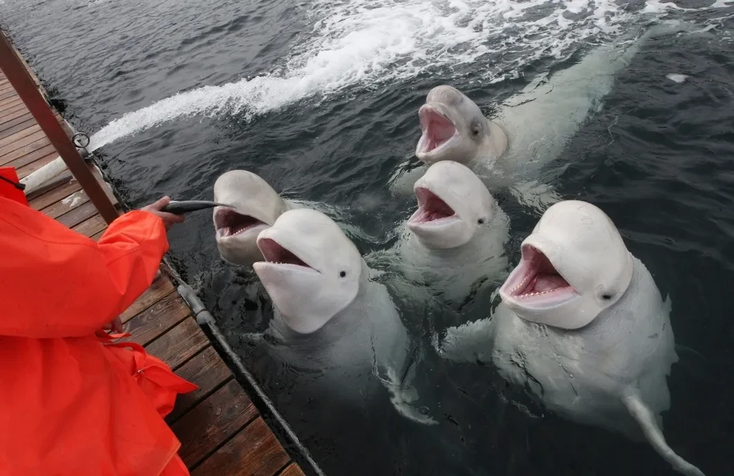 Жертвы кровавого киднеппинга подплывали к краю вольера, с любопытством пялились на нас, разевали беззубые рты. Отловленные летом и в начале осени, они родились этой весной. Детки постарше пытались плеваться в нас водой, но делали это еще неумело: взрослая белуха прицельно выпускает изо рта струю воды на несколько метров, а эти только себя заплевали.