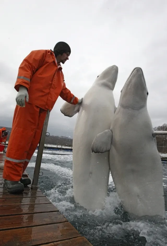 Эта привязанность к тренерам — не новая любовь на века, а условия выживания и психической сохранности. В случае их продажи они все равно сменят тренера, а поймали их именно для перепродажи. Задача сотрудников адаптационной базы — что звучит в самом ее определении — это адаптация свободных животных к неволе, к взаимодействию с человеком в условиях замкнутого пространства и, перво-наперво, к питанию рыбой.