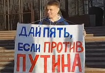 В мае Шабарчин провел акцию с плакатом "Дай пять, если против Путина". Тем, кто против Путина, предлагалось пожать пикетчику руку.