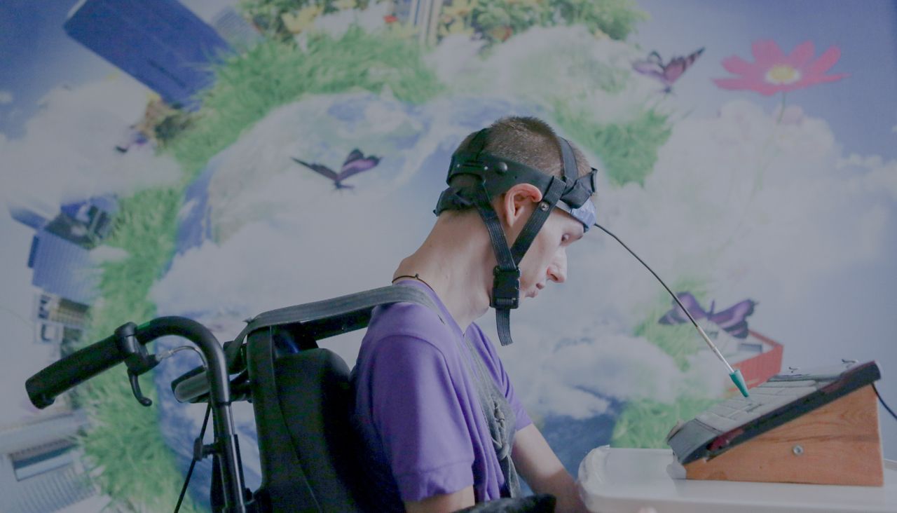 Наш разговор с Басалаевым продолжается семь часов. 35-летний Сергей сидит в инвалидной коляске. Говорить голосом он не может. На его голове — обод из ремней от сварочной каски, на лбу закреплен сварочный стержень с резиновым наконечником. К коляске прикреплена подставка для клавиатуры, в метре от него стоит большой монитор с открытой программой Word.