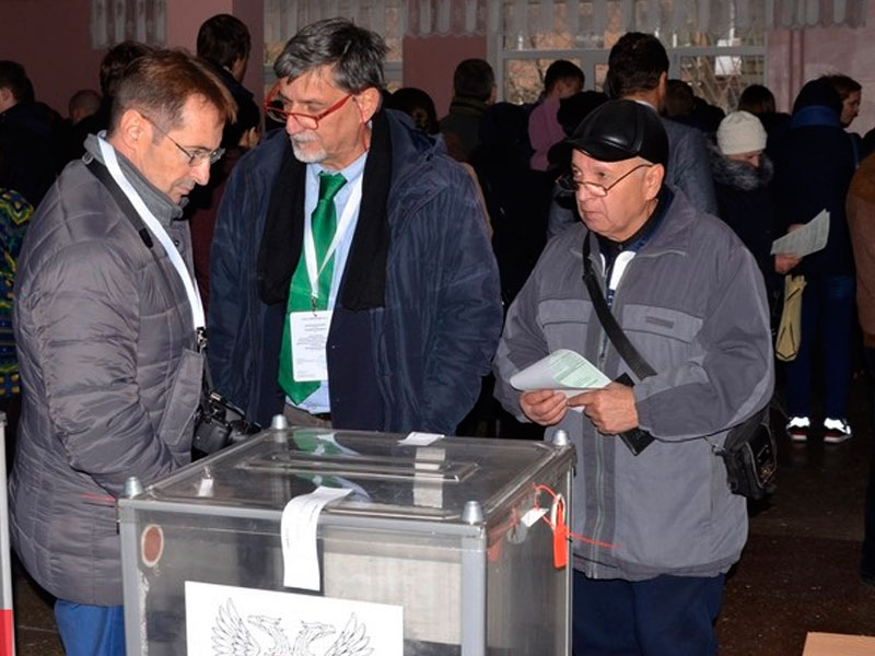 Наблюдатели на выборах в ДНР / vk.comВ соседней самопровозглашенной народной республике, Луганской, основным претендентом на пост президента был также и.о. главы — Леонид Пасечник, он возглавил ЛНР в ноябре 2017 года, после того как Игорь Плотницкий уехал в Москву и сложил с себя полномочия. ЦИК ЛНР, после подсчета 96% бюллетеней Пасечник получает 68,4% голосов при явке 77%.