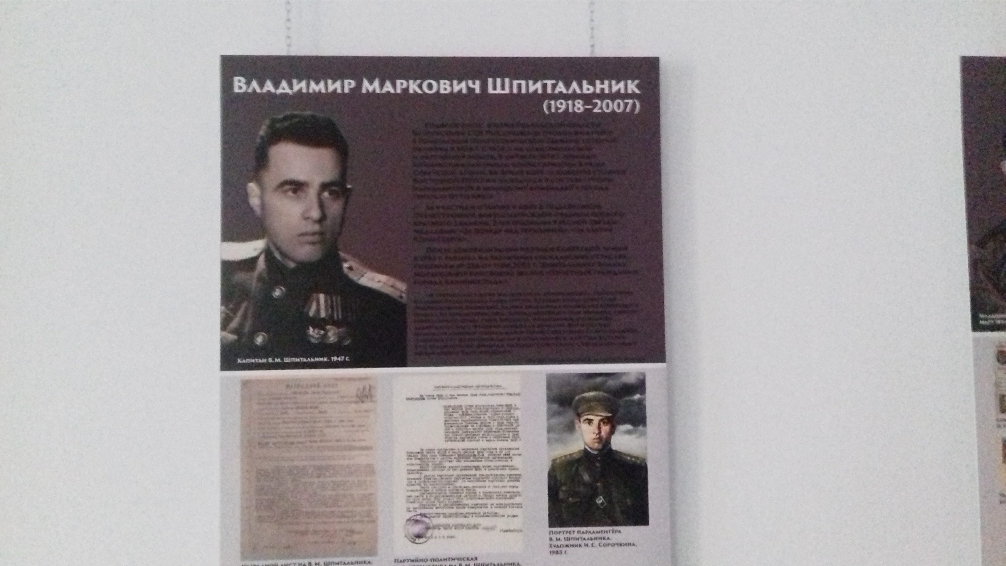 – В Кёнигсберге жило очень много известных евреев, – говорит Плитман. – Это были врачи, ученые, два лауреата Нобелевской премии. Мы хотим восстановить историю, будем искать материалы, многое есть в Германии. И делается это для всех калининградцев. Сейчас у нас работает выставка, рассказывающая о евреях – участниках штурма Кёнигсберга 1945 года. Вот фото Владимира Шпитальника – он был парламентером, когда подписывали пакт о капитуляции, он шел в бункер гауляйтера Восточной Пруссии. Вот известный врач Леонид Шор, это мой отец Зяма Плитман, который тоже штурмовал город.
