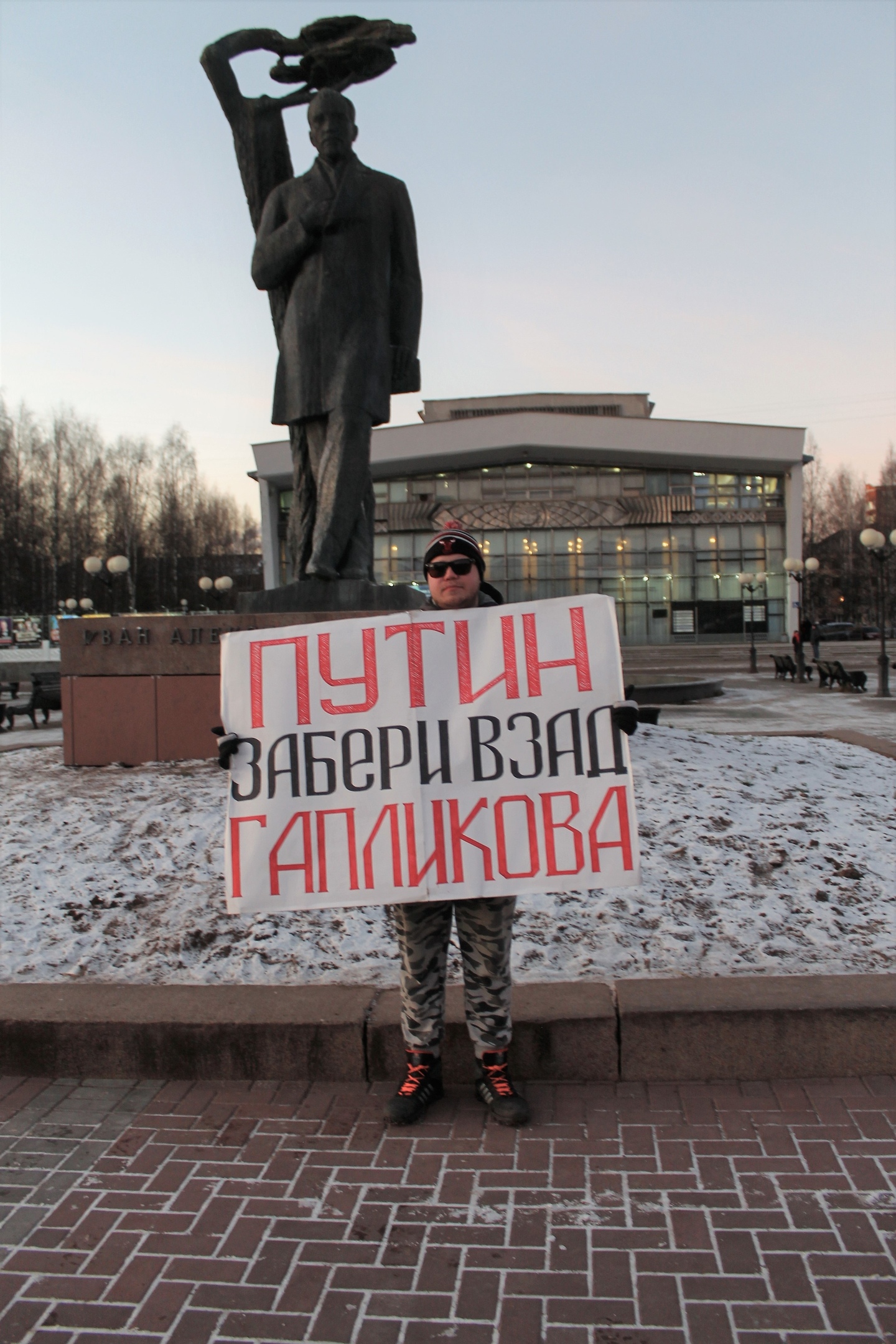 Гражданские активисты продолжают серию одиночных пикетов под девизом - "Путин забери взад Гапликова". Поводом проведения акции стало отвратительное поведение Главы Республики, и нежелание работать на благо территории которую ему доверил Глава Государства.