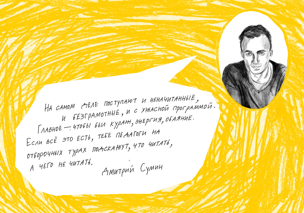 Дмитрий Сумин: На самом деле поступают и неначитанные, и безграмотные, и с ужасной программой. Главное — чтобы был кураж, энергия, обаяние. Если все это есть, тебе педагоги на отборочных турах подскажут, что читать, а чего не читать.