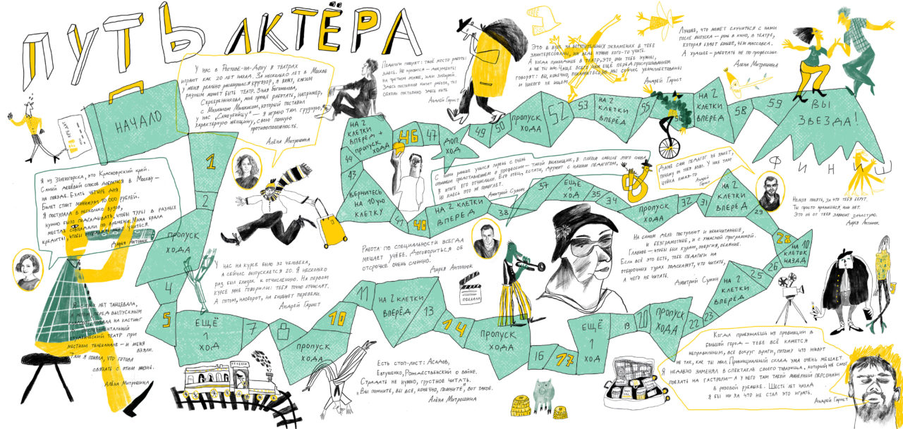 Выпускники Школы-студии МХАТ-2018 — Дарья Антонюк, Андрей Гарист, Алена Митрошина и Дмитрий Сумин — рассказали нам, как они поступали, учились и делали первые шаги в актерской карьере, а мы превратили их рассказ в традиционную настольную игру-бродилку.