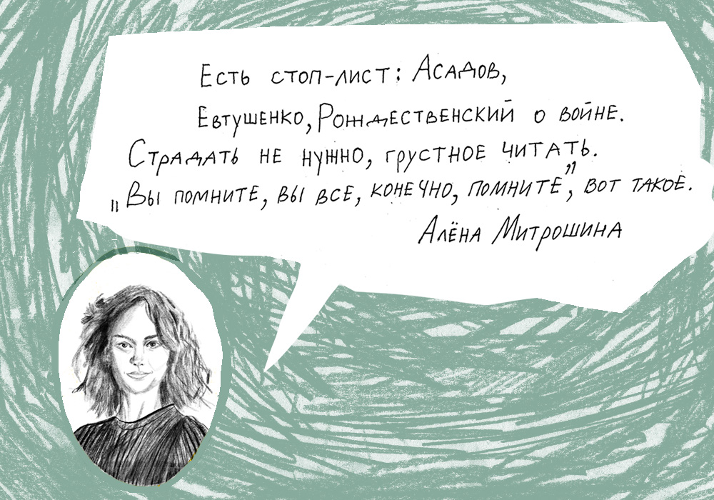 Алена Митрошина. Есть стоп-лист: Асадов, Евтушенко, Рождественский о войне. Страдать не нужно, грустное читать. «Вы помните, вы все, конечно, помните», вот такое.
