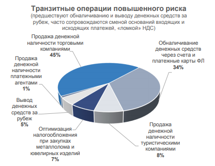 - Почти все операции по обналичиванию денег (95%) в первом полугодии 2018 года завершались выдачей денег со счетов физлиц и юрлиц, говорится в статистике ЦБ. Больше всего (45%) транзитных операций, предшествующих обналичиванию и выводу денег за рубеж, совершают торговые компании, 34% приходится на схемы с переводами денег на карты и платежные счета физических лиц, на третьем месте (8%) — туристические фирмы.