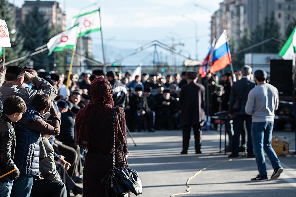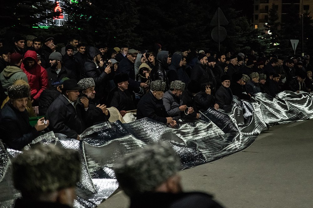 Сотни людей бежали по кругу. Мелькали папахи, широкополые шляпы и круглые тюбетейки с кисточками, куртки хипстеров и униформа полиции. Толпа на площади закручивалась в огромную воронку, куда со всех сторон вливались всё новые верующие. В ночном небе реяли флаги Ингушетии со старинным символом солнца. Алое кольцо с тремя лучами до странного напоминало происходящее внизу. Сотни глоток синхронно выкрикивали «Ля Иляха илля Ллах!» — «Нет Бога кроме Аллаха!» В заблокированной, охраняемой вооружёнными людьми столице Ингушетии совершался зикр — суфийский обряд поминания Бога. Эти ритуалы спонтанно сменяли речи ораторов уже несколько дней подряд. Таков был самый удивительный протест России XXI века — миролюбивый и воинственный, оппозиционный и лояльный одновременно. Двадцать шестого сентября глава Ингушетии Юнус-Бек Евкуров и глава Чечни Рамзан Кадыров подписали соглашение об определении границы между республиками, неделю спустя на митинги в Магас ехали уже тысячи ингушей со всей России.