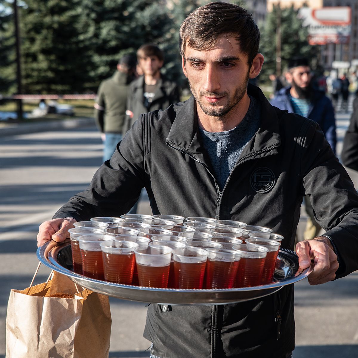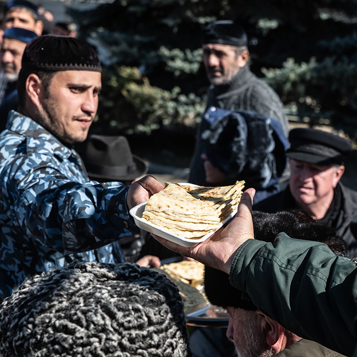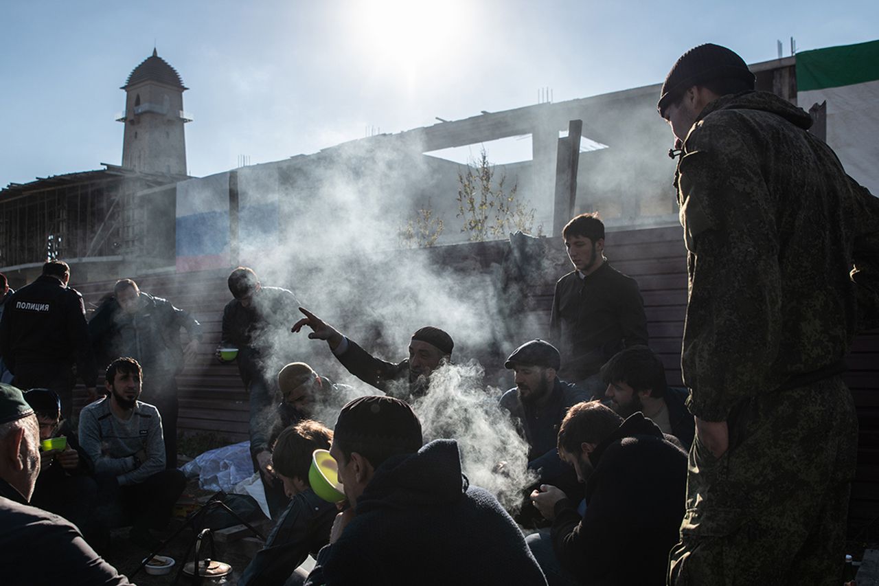 К теме героический смерти Хамзат возвращается постоянно. Видно, что он много размышлял об этом. В начале митинга участники готовились к силовому разгону, к стрельбе не только в воздух. Все вздохнули с облегчением, когда генерал МВД Сергей Бачурин пообещал безопасность. В итоге отношения протестующих и полиции стали почти идиллическими: солдаты участвовали в коллективных молитвах, получали гостинцы и позировали для фотографий с подаренными шоколадными батончиками. Редкий старейшина не похвалил генерала: поговаривали, что полиция не пустила силовиков из соседних регионов. Вежливо, но твёрдо сказали: справимся сами.Проблем у служителей порядка и вправду особых не было. На площади всё происходило словно само собой: одни приносили еду, другие делились новостями, третьи укрывали сидевших на лавочках старейшин, чтобы те не замёрзли ночью. За юношей, раздающим обеды, следовал подросток с салфетками, а за ним, немного погодя, — мальчик с пластиковым мешком для мусора. На митинге, продолжавшемся круглосуточно две недели, царила идеальная чистота.