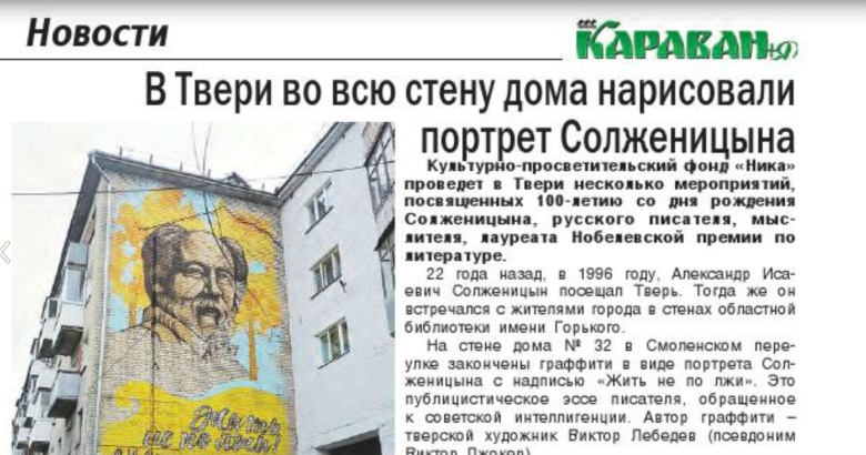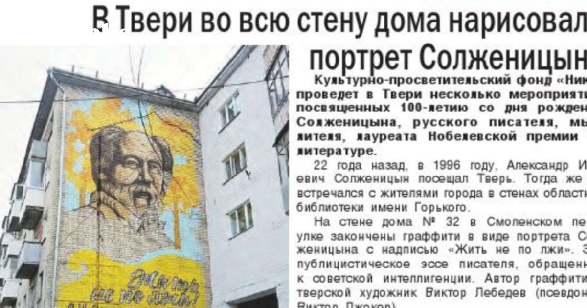 11 декабря исполняется сто лет Александру Солженицыну, и, кажется, вот старт торжеств – в Твери недорисованное граффити с портретом писателя и подписью «Жить не по лжи» закрашивают, а на художника составляют административный протокол. Картины на торцах хрущевских и брежневских пятиэтажек с некоторых пор – очень распространенная и поощряемая властями форма городского малобюджетного благоустройства, и обычно такие изображения наносятся на стены без скандала и протестов, но тут, видимо, особый случай. Жильцы собирают подписи против, подключаются местные власти – в общем, спорная ситуация, требующая компромиссного разрешения.
