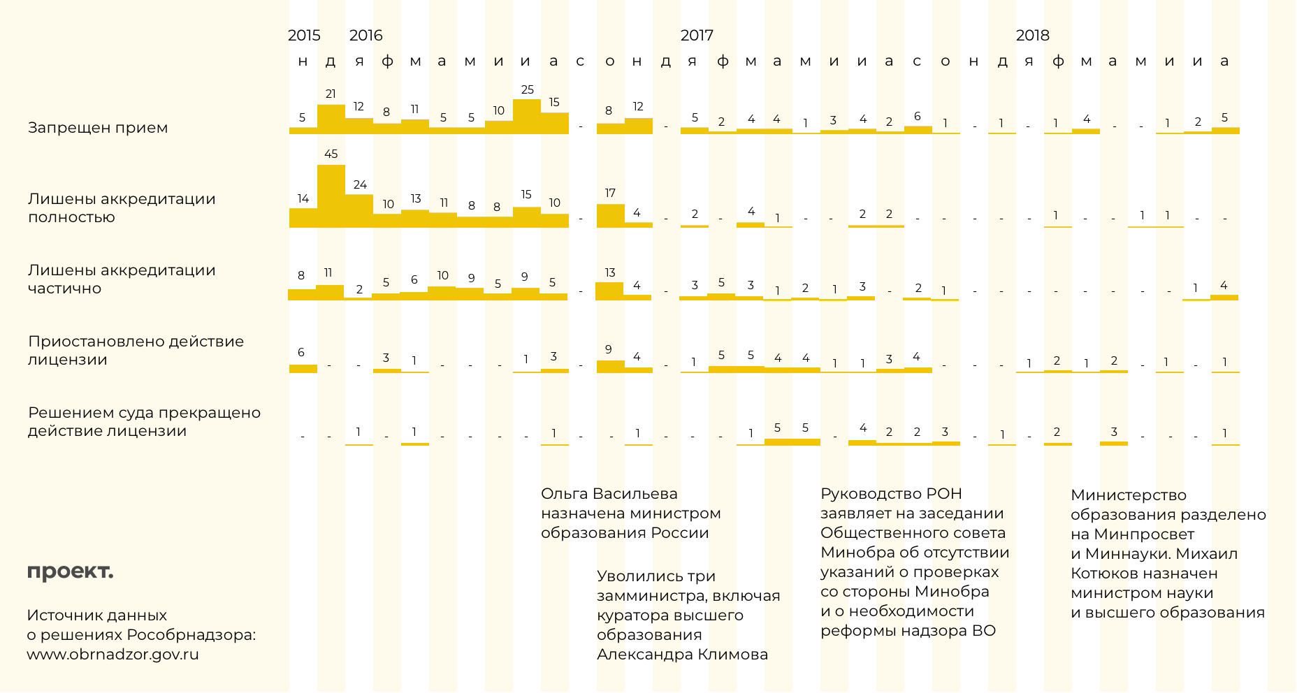 Как Рособрнадзор принимал решения по итогам проверок вузов в 2015-2018 годах и что в это время происходило в министерстве образования России