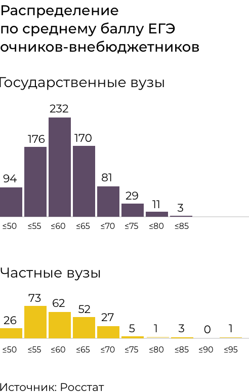 Наконец, частным вузам труднее привлекать успешных абитуриентов: из-за малого числа бюджетных мест средний балл ЕГЭ поступающих в них ниже, чем в государственных.