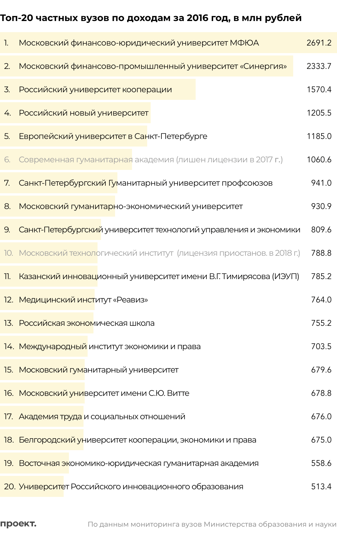 Рынок частного образования очень неравномерен. На 20 вузов (это 10% общего числа частных) приходится 51% общего заработка сектора. Первые по доходу 20 вузов зарабатывают больше 500 млн руб. в год, первые девять — больше 800 млн руб.