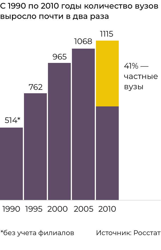 С момента распада СССР и до начала нынешнего десятилетия количество вузов в России последовательно росло. И в основном за счет частных институтов и университетов. В 1990 году в РСФСР было 514 вузов (без филиалов), в 1995 — 762, в 2000 — 965, в 2005 — 1068, в 2010 — 1115. 41% из них — частные вузы.