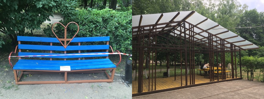 К проектированию подключились местные художники и удалось спроектировать аналоги арт-объектов: разноуровневые лавки, парковые скамейки, лавки-шезлонги.