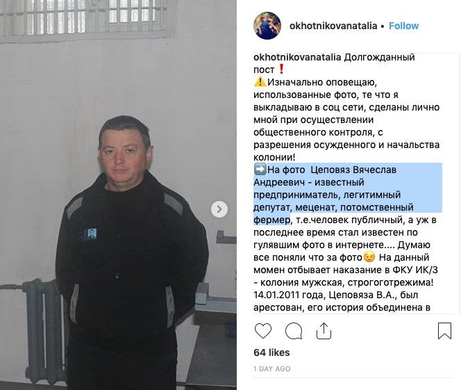 В тот же день она рассказала, что проверка из-за фотографий, на которых Цеповяз ест деликатесы и жарит шашлык, уже проходила весной 2018 года, и состава преступления в действиях сотрудников колонии не нашли.