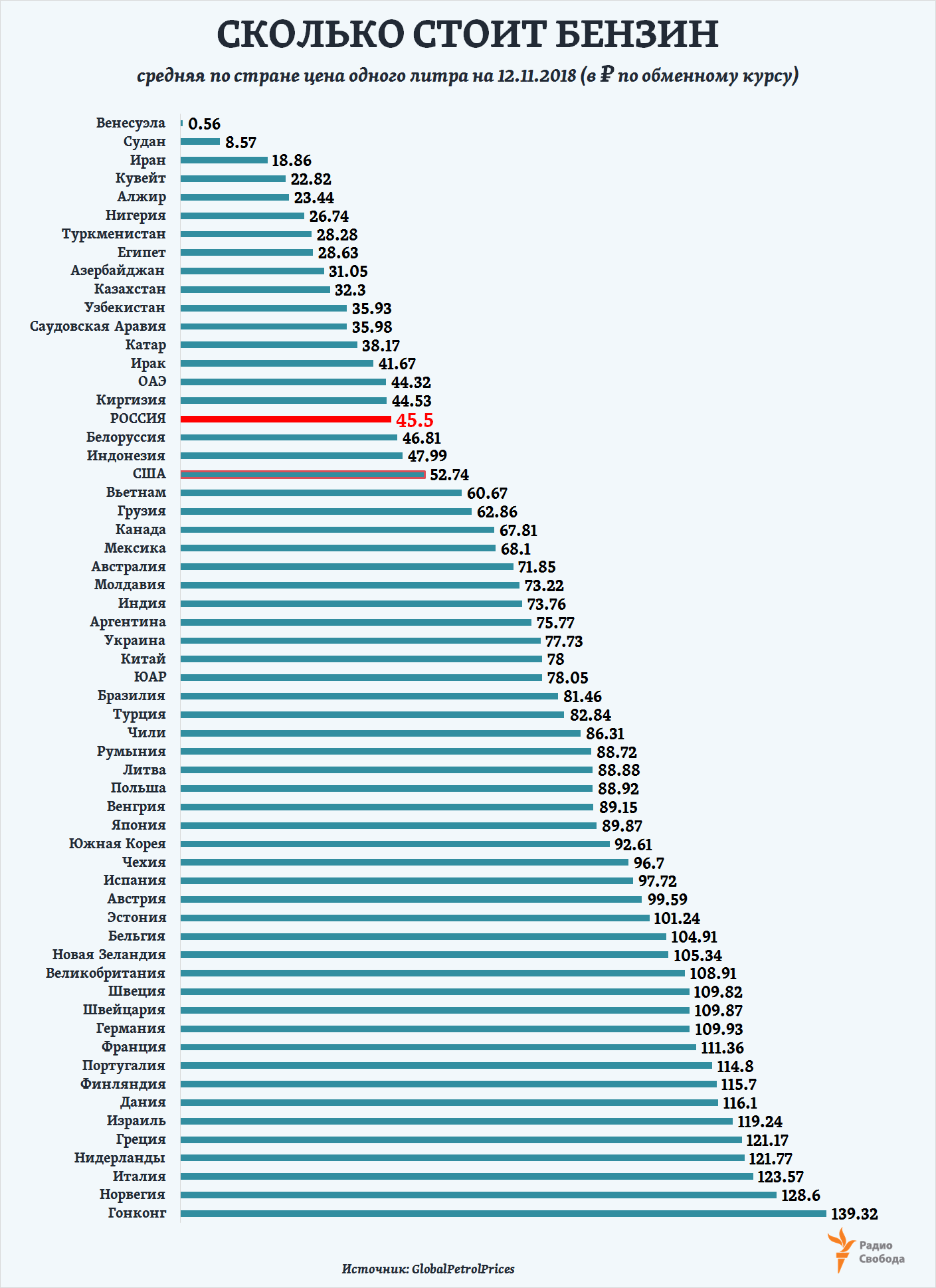 В абсолютных величинах текущие цены на бензин в России оказываются уже лишь немногим ниже, чем в Соединенных Штатах (где добывается сегодня почти столько же нефти, сколько и в России), но при этом они почти в 3 раза выше средней для 28 стран ЕС (где импорт покрывает более 80% общего спроса на нефть):