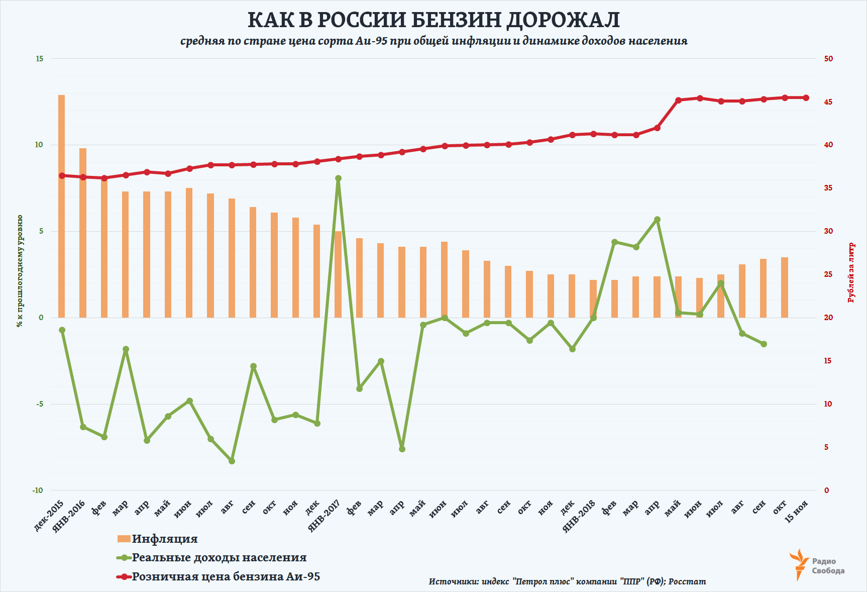 Source: Россия-24 ДА, НО... Цена бензина в России сегодня – почти как в США, а налогов в ней – как в ЕвропеЗа три последних года, с декабря 2015-го, автомобильный бензин (сорта Аи-95) подорожал в России на четверть – средняя цена одного литра на АЗС повысилась на 24,2%, судя по индексу “Петрол плюс” российской компании “ППР”, оператора платежей по топливным картам в России и странах Восточной Европы. И почти половина этого прироста пришлась на апрель-ноябрь текущего года.