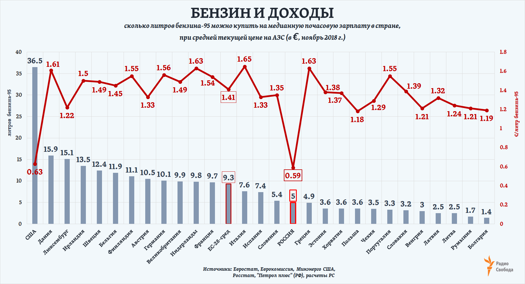 Однако в какой мере текущие цены на бензин отражают в целом доступность автомобильного топлива в той или иной стране для среднестатистического ее жителя, исходя из его текущих доходов? По последним из имеющихся на сегодня данным официальной статистики в России, США и Европе мы примерно рассчитали, сколько именно литров автомобильного бензина можно купить сегодня на сумму среднего по стране почасового заработка.