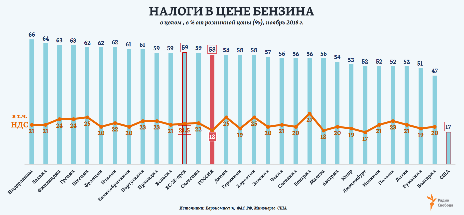 И поясняла при этом, что “составляющая налогов в конечной цене каждого проданного в стране литра автомобильного топлива составляет порядка 60%”. Речь идет о налоге на добавленную стоимость (НДС), а также акцизах и налоге на добычу полезных ископаемых (НДПИ).